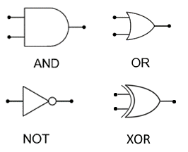 Create, modify and interpret simple logic circuit diagrams. Students will only need to use NOT, AND, OR and XOR gates within logic circuits. Students will be expected to understand and use the following logic circuit symbols:  | Students should be able to construct simple logic circuit diagrams which contain up to three inputs. |