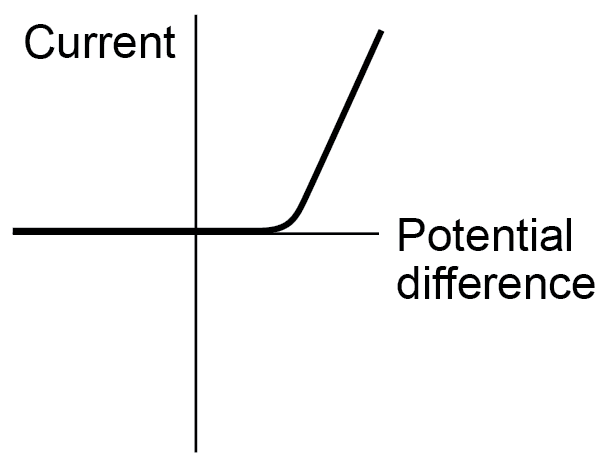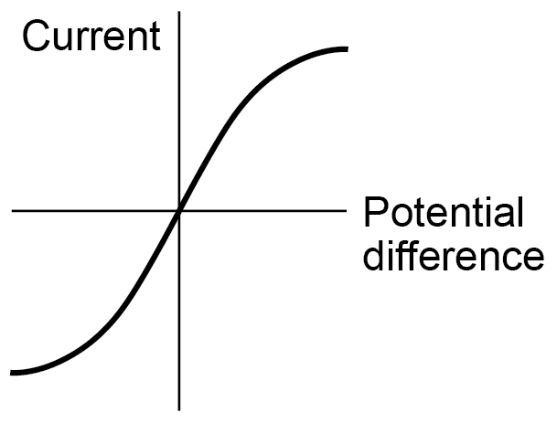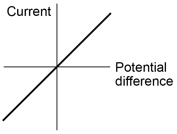 Students should be able to explain that, for some resistors, the value of R remains constant but that in others it can change as the current changes. The current through an ohmic conductor (at a constant temperature) is directly proportional to the potential difference across the resistor. This means that the resistance remains constant as the current changes.  The resistance of components such as lamps, diodes, thermistors and LDRs is not constant; it changes with the current through the component. The resistance of a filament lamp increases as the temperature of the filament increases.  The current through a diode flows in one direction only. The diode has a very high resistance in the reverse direction.  | |